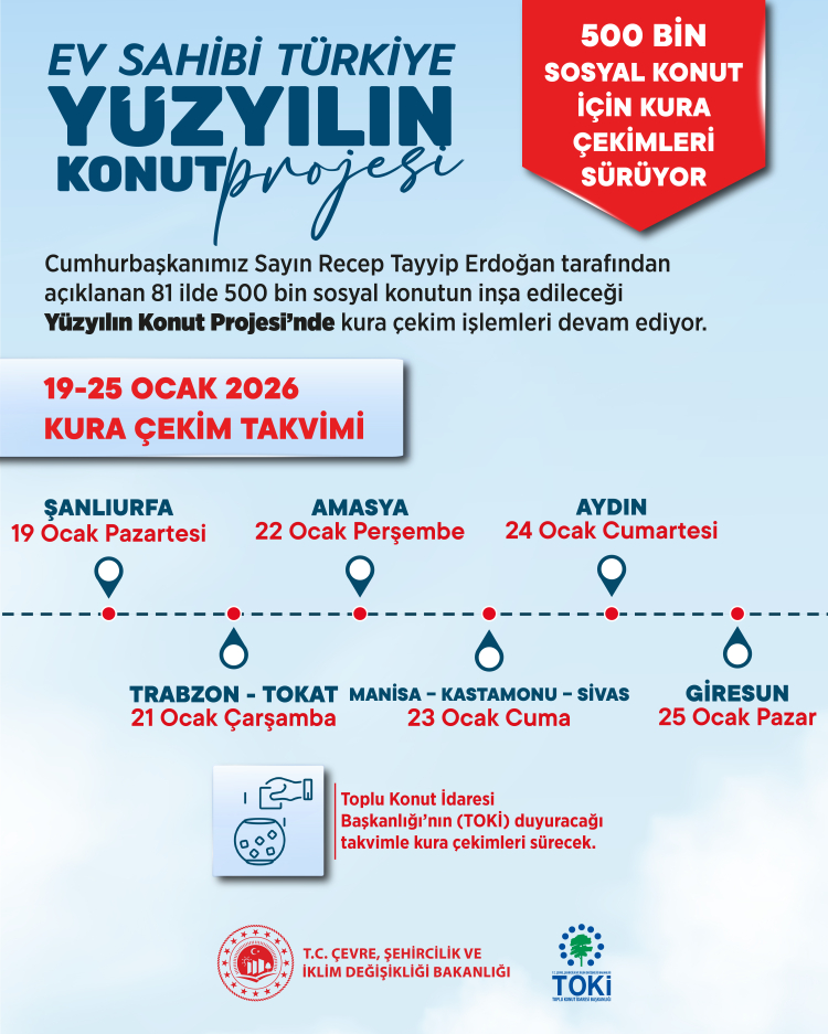 19 Ocak Pazartesi günü Şanlıurfa'da 13 bin 790, 21 Ocak Çarşamba Trabzon'da 3 bin 734, Tokat'ta 3 bin 392, 22 Ocak Perşembe Amasya'da 2 bin 601, 23 Ocak Cuma Manisa'da 7 bin 459, Kastamonu'da 2 bin 380, Sivas'ta 3 bin 904, 24 Ocak Cumartesi Aydın'da 6 bin 973, 25 Ocak Pazar günü de Giresun'da 1.676 konut için kura çekimi yapılacak.