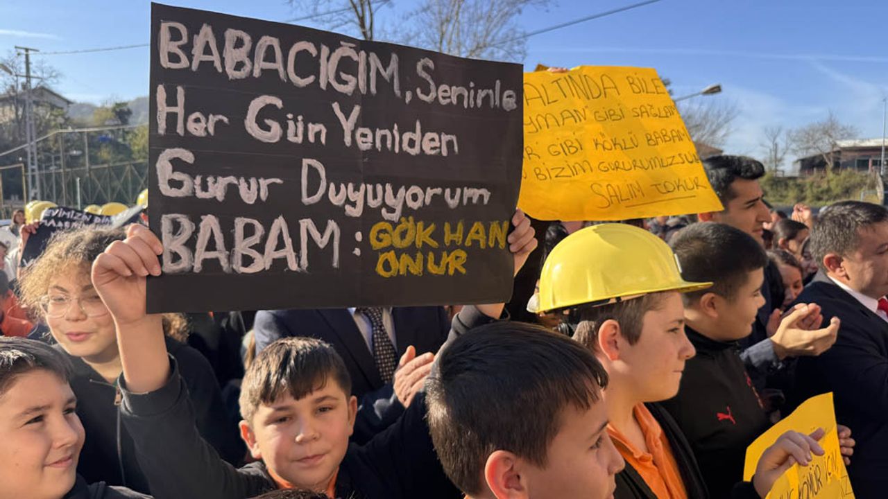 'Taş kömürü değil, babamın emeği en değerli enerjimizdir', 'Kömürün her zerresi babamın helal kazancının ispatıdır', 'Babamın karanlıktaki emeği, bizim aydınlıktaki geleceğimizdir', 'İş güvenliği ve insan hayatı her şeyden önemlidir' yazılı dövizler taşıyan çocuklar, babalarıyla hatıra fotoğrafı çektirdi.