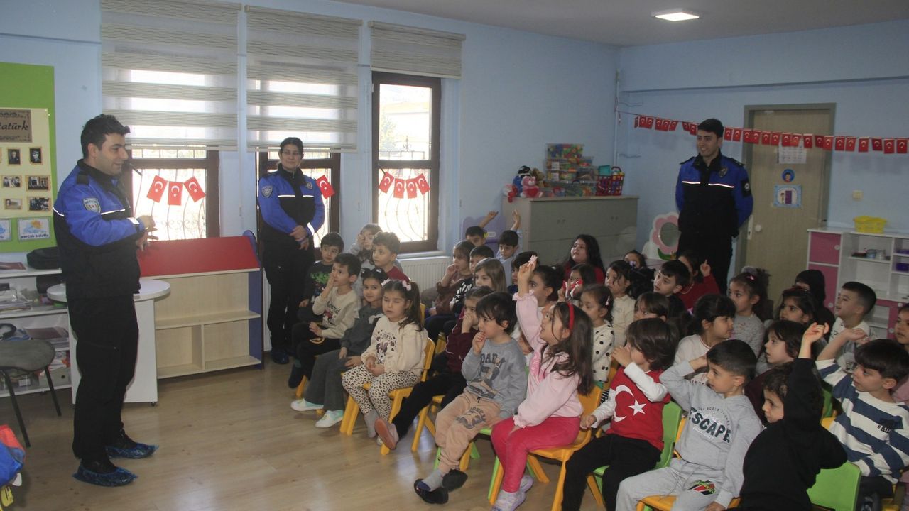 Polis ekipleri, 10 anaokulunu ziyaret ederek, minik öğrencilere yabancılarla iletişimde dikkat edilmesi gereken hususlar, güvenli oyun alanları, karşıdan karşıya geçiş kuralları ve internet ortamında güvenli davranış biçimlerini anlattı.