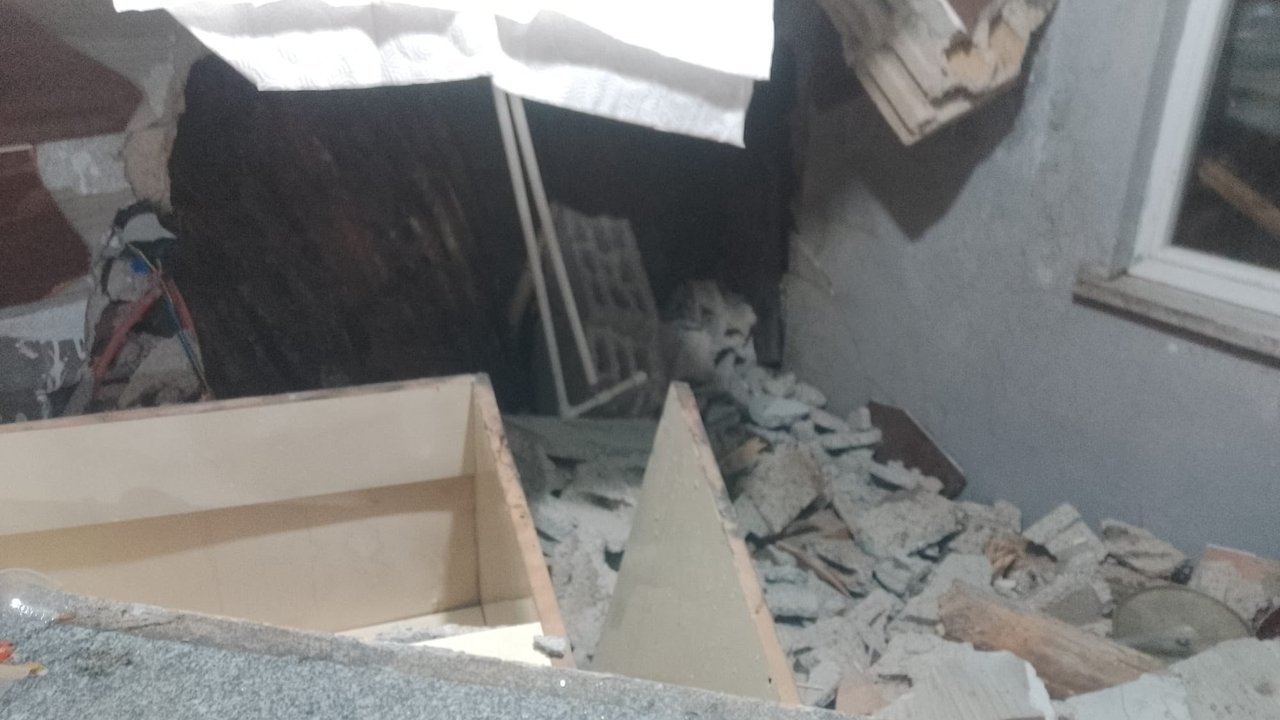 Evin bir odasının duvarı yıkıldı, ayrıca bitişiğindeki ahşap ahır ve odunluk kullanılamaz hale geldi.
