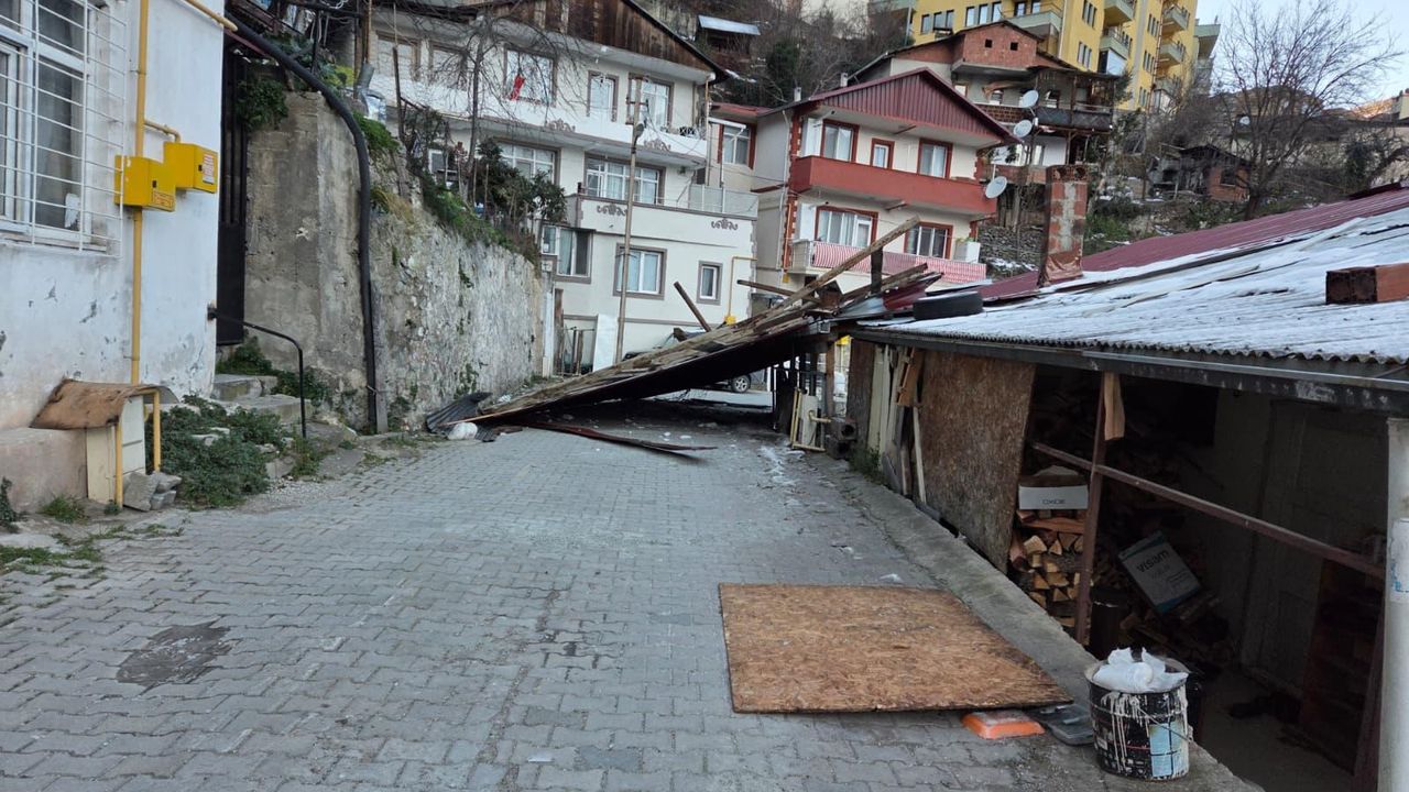İhbar üzerine bölgeye sevk edilen belediye ekiplerince çatı parçaları bulunduğu yerden kaldırıldı.