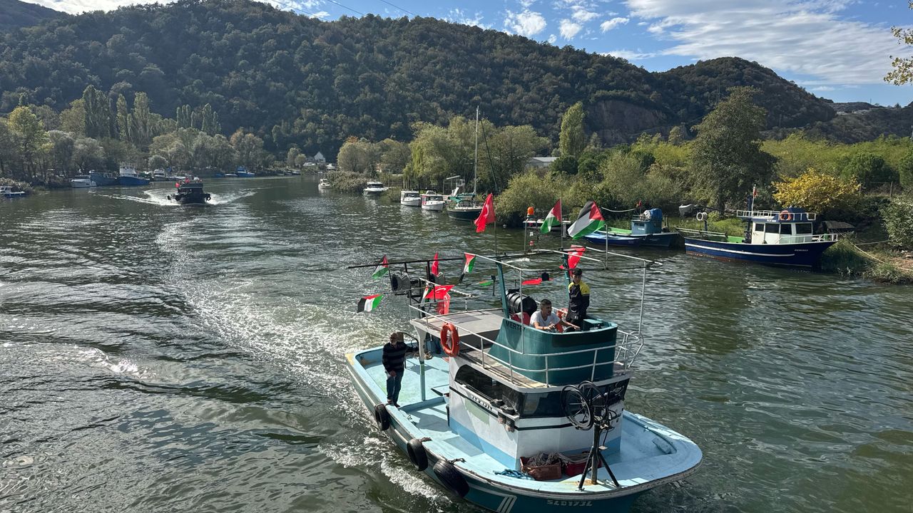 'Nehirden denize özgür Filistin' adı altında Küresel Sumud Filosu'na destek amacıyla Türk ve Filistin bayraklarıyla donatılan tekne ve balıkçı motorları, boğaz mevkisinden klakson çalarak yaklaşık 14 kilometre mesafede kent merkezindeki eski iskeleye geldi.