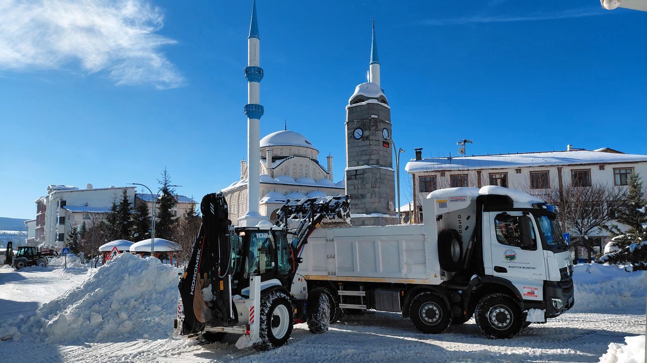 İlçe merkezinde 15 Temmuz Şehitler Meydanı'ındaki kar yığınları kamyonlar ile taşınmaya başlandı.
