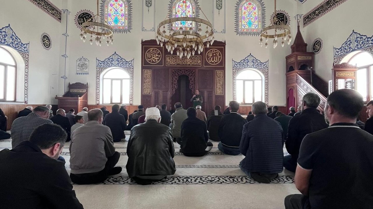 Halkla İlişkiler Uzmanı Selimhan Kırmızıoğlu, Efendi Bayram Camisi'nde öğle namazı öncesinde cemaate yönelik bağımlılıkla mücadele konusunda eğitim verdi.