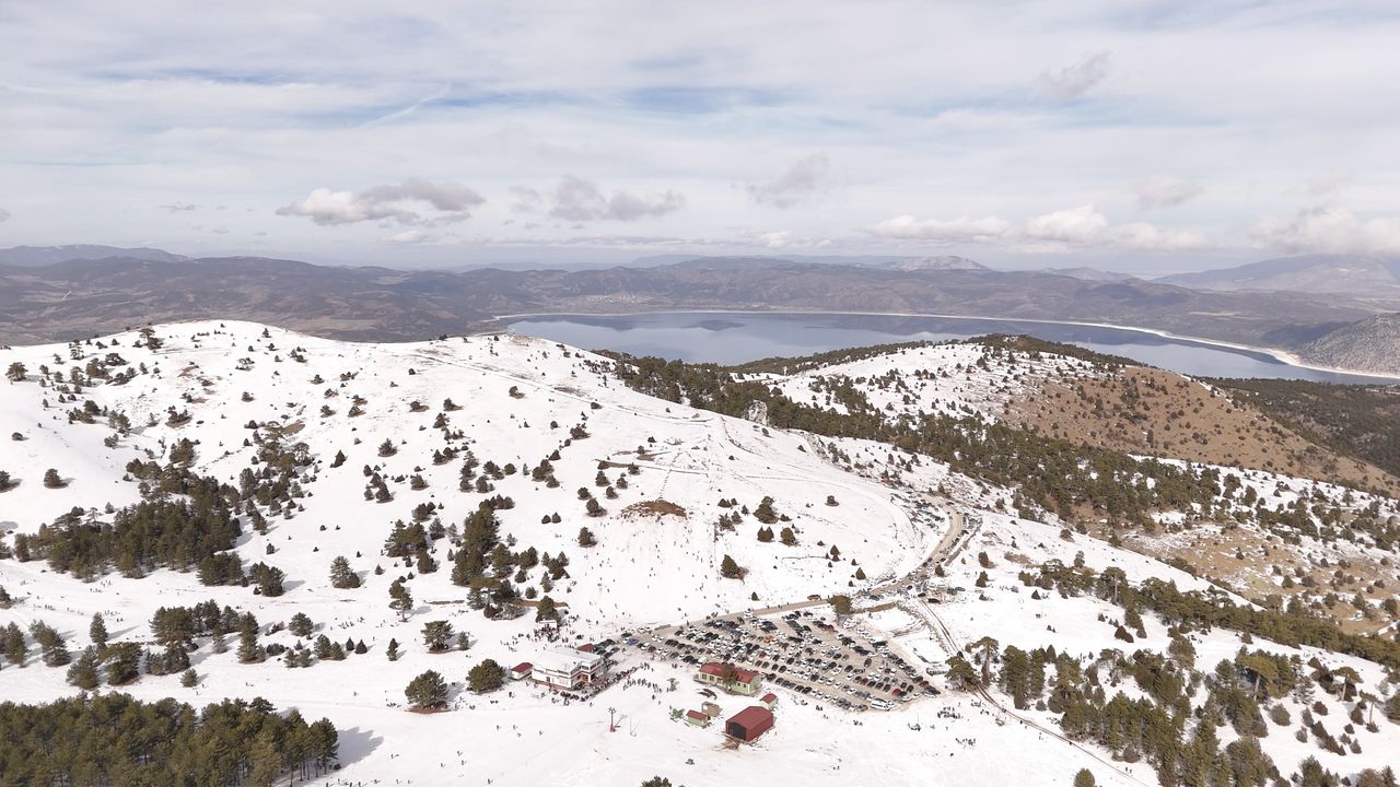 Kış mevsiminde ziyaretçiler, karla kaplı çam ormanlarının arasında bulunan Salda Gölü'ne hakim 2 bin 79 metre rakımlı Tınaztepe'ye kurulu kayak merkezinde, kayağın ve göl manzarasının tadını çıkarıyor.