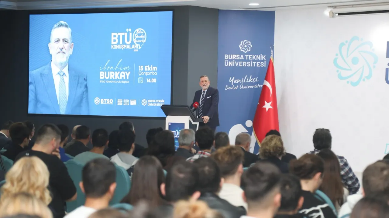 BTÜ Konuşmaları'nın konuğu olan BTSO Başkanı İbrahim Burkay, öğrencilere seslenerek, girişimcilik ruhunu kaybetmeden cesaretle adım atmaları gerektiğini söyledi. 'Türkiye'nin ikinci yüzyılını sizler inşa edeceksiniz. Şikâyet etmeye hakkınız yok; gelecek sizin ellerinizde' diyen Burkay, gençleri stratejik düşünmeye, değerlerine sahip çıkmaya ve aksiyon almaya davet etti.