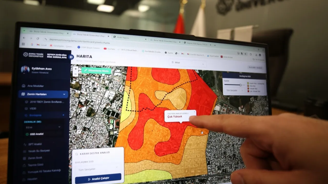 Bursa Teknik Üniversitesi (BTÜ) akademisyenleri, yaklaşık 3 yıllık bilimsel çalışmaların ardından geliştirdiği yazılımla vatandaşların, binaların deprem dayanıklılığı, zemin sıvılaşması ve risk durumunu tek tuşla sorgulayabilmesini sağladı. Sistem şimdilik Bursa Yıldırım ilçesinde aktif ve ücretsiz hizmet veriyor.