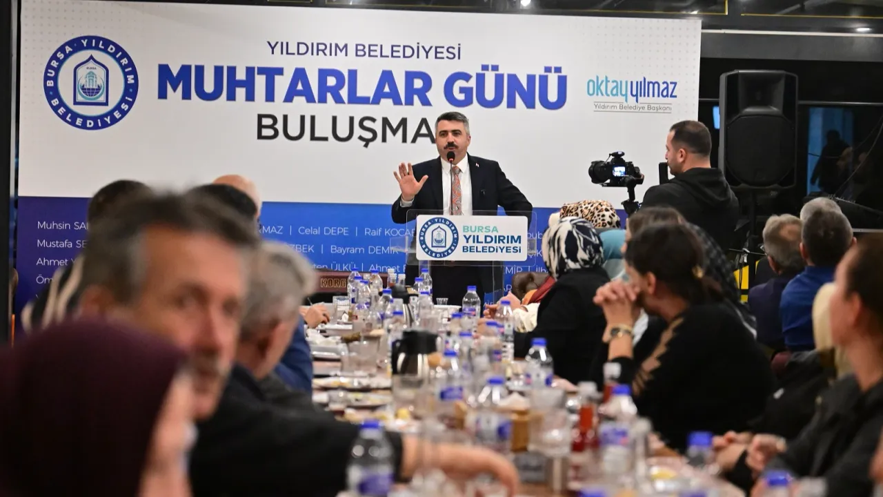 Bursa'da Yıldırım Belediye Başkanı Oktay Yılmaz, 19 Ekim 'Muhtarlar Günü' dolayısıyla ilçedeki mahalle muhtarları ile bir araya geldi.