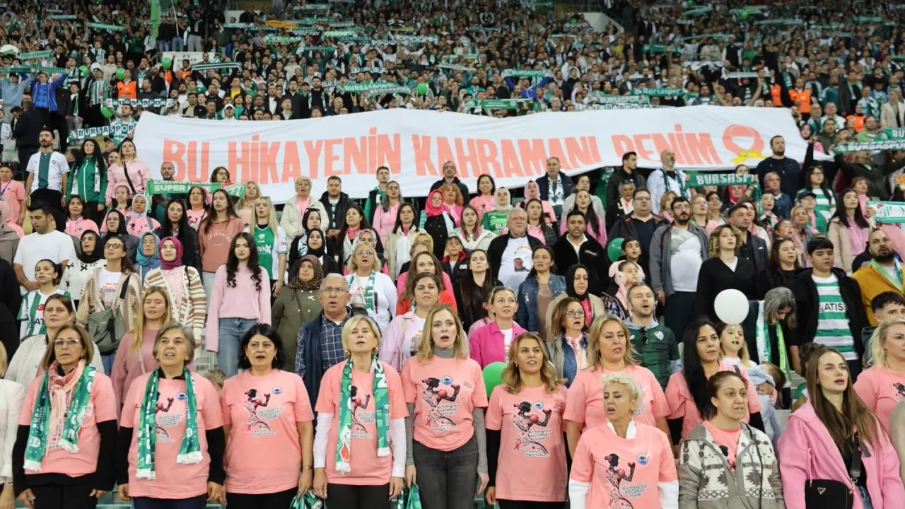 Bursa Büyükşehir Belediyesi, 'Meme Kanseri Farkındalık Ayı' kapsamında yaklaşık 100 kadını pembe tişörtlerle Bursaspor-Menemen Belediyespor maçında buluşturdu. Başkan Mustafa Bozbey'in eşi Seden Bozbey de tribünde kadınlarla birlikte farkındalık mesajı verdi.