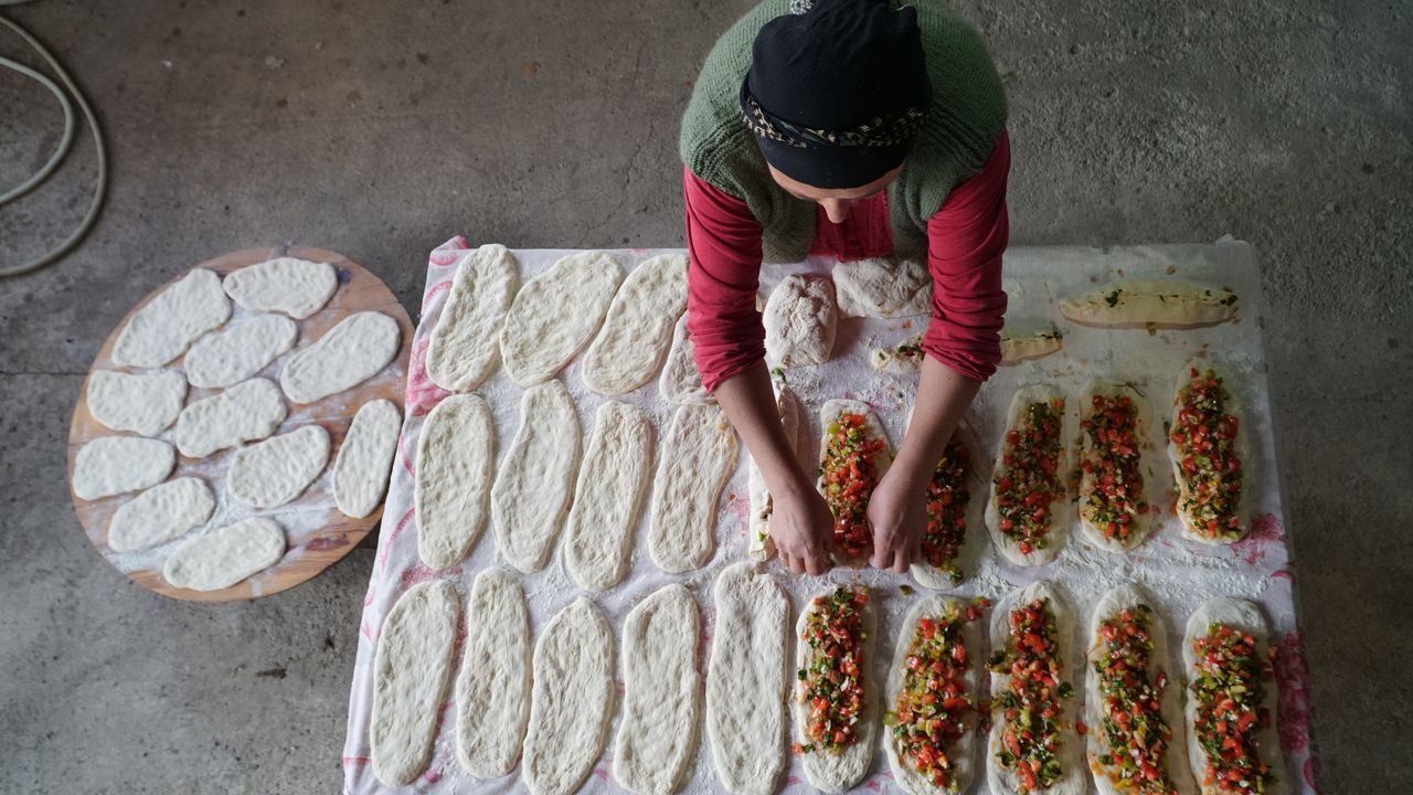 Evlerinde hamurunu ve iç malzemesini hazırlayan kadınlar, fırında kaşarlı, peynirli, çökelekli, kıymalı ile sebzeli pidelerini pişiriyor.