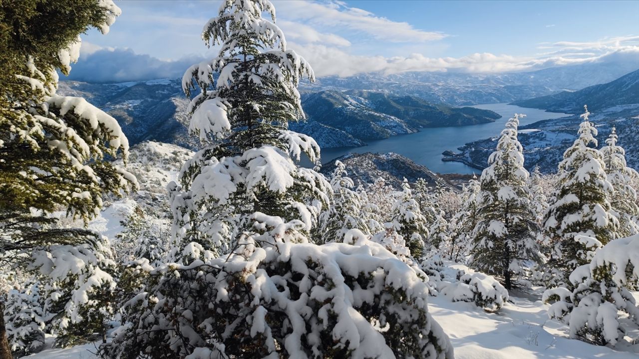 Kızılırmak Nehri üzerine kurulu Obruk Barajı'nın çevresindeki orman da beyaz örtüyle kaplandı.