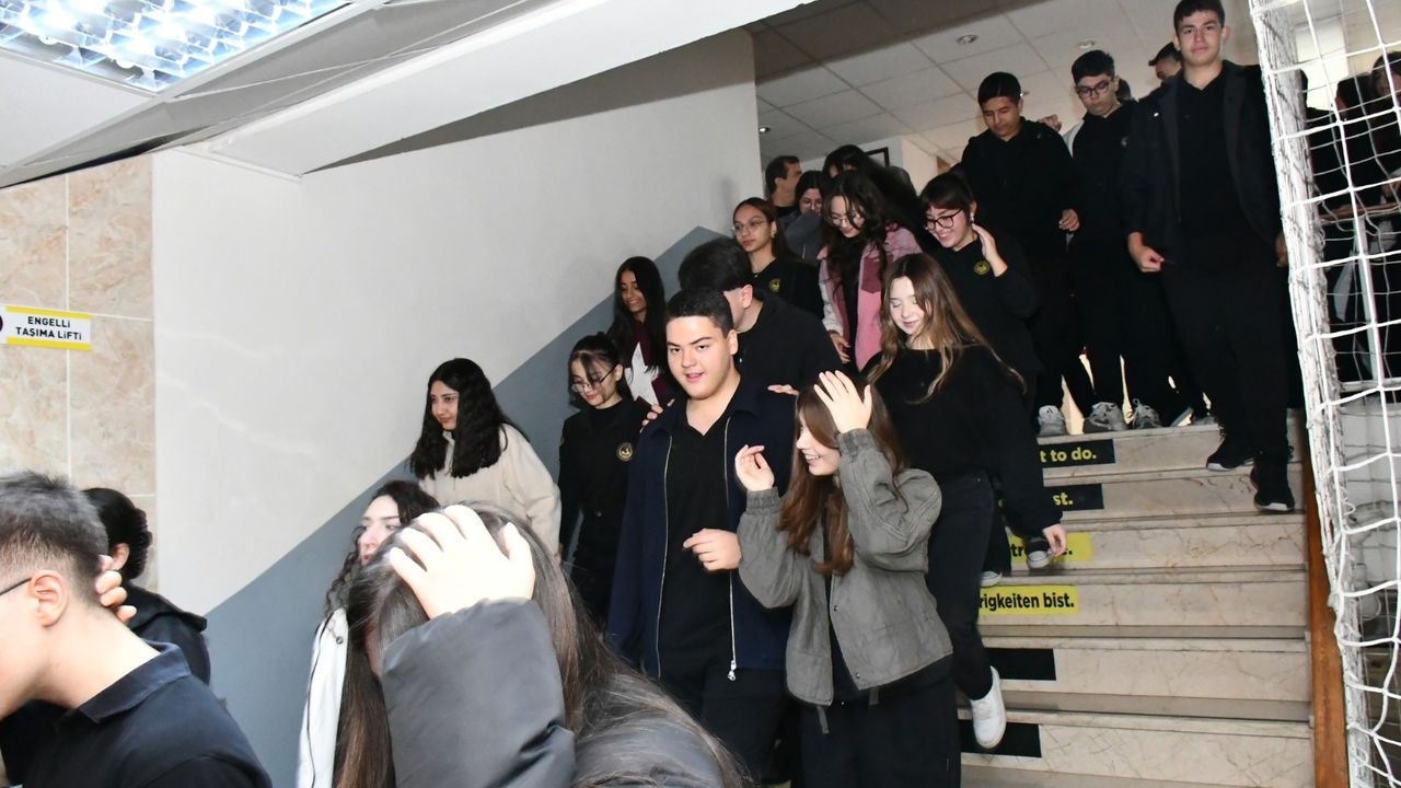 Ardından senaryo gereği ilk sirenin çalmasıyla 'çök-kapan-tutun' hareketini uygulayan öğrenciler, ikinci sirenle birlikte okul binasından tahliye edildi.