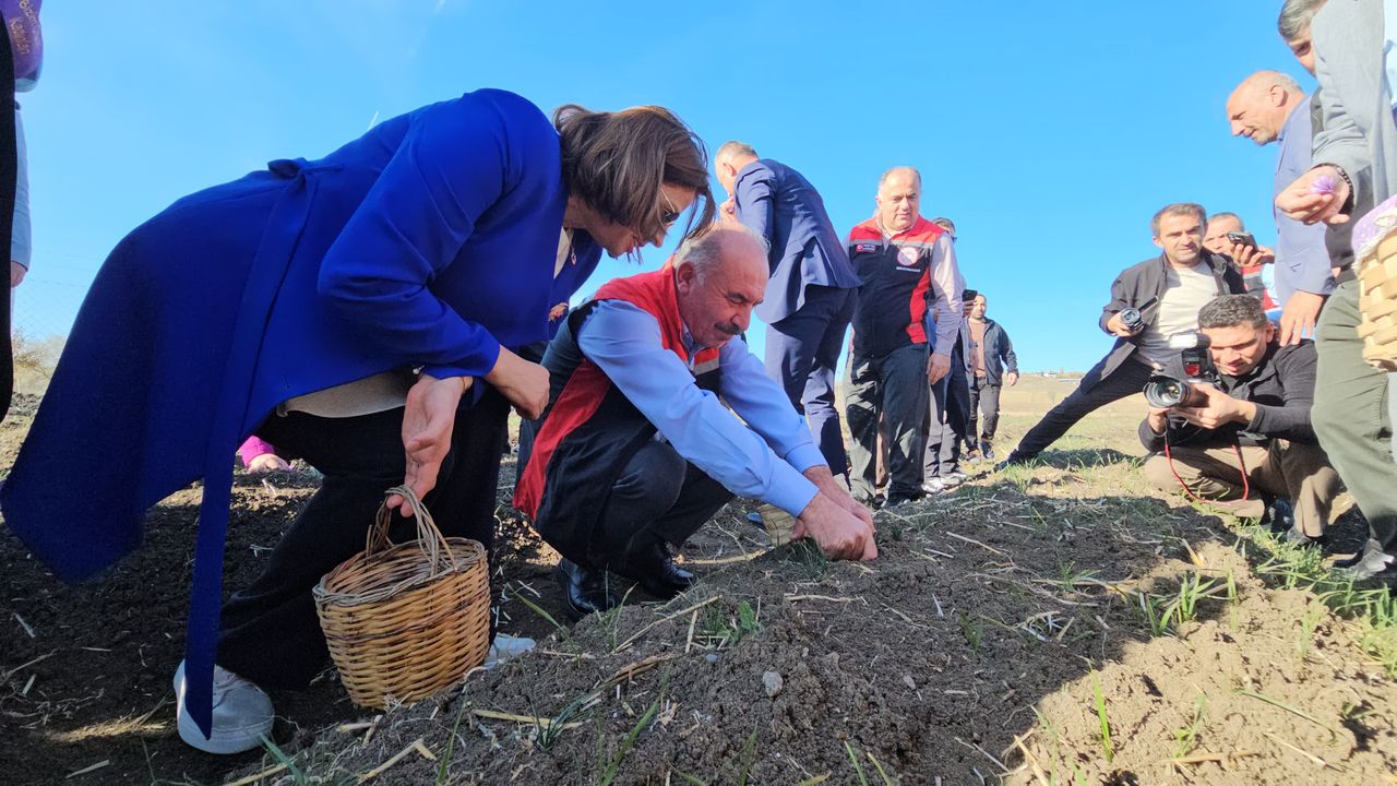 Konuşmaların ardından protokol üyeleri ve katılımcılar, hep birlikte safran tarlasında ilk hasadı yaptı.