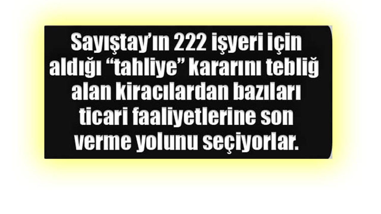 Belediye de bu Sayıştay’ın ilgili k raporu çerçevesinde “ihale ile kiraya verilen işyerlerinin kiralama süresi bittiğinden dolayı haksız işgalci olduğunuzdan tebliğden itibaren on be gün içinde kiralananı tahliye etmenizi rica ederiz” bildirimini göndermişti.