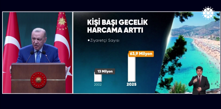 Ziyaretçi sayısının 2002'de 13 milyon iken 2025'te 63,9 milyona ulaştığını hatırlatan Erdoğan, 2026 yılı hedefinin 68 milyar dolar turizm geliri olduğunu açıkladı.