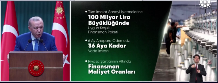 Cumhurbaşkanı Erdoğan, imalat sanayi işletmelerine yönelik yeni bir destek paketini de kamuoyuyla paylaştı. Tüm imalat sanayi işletmelerine açık, 100 milyar lira büyüklüğünde uygun koşullu bir finansman paketinin devreye alındığını belirten Erdoğan, paketin 6 ay anapara ödemesiz ve 36 aya kadar vadeli olacağını söyledi.