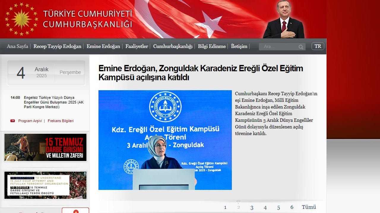 "Cumhurbaşkanı Recep Tayyip Erdoğan'ın eşi Emine Erdoğan, Millî Eğitim Bakanlığınca inşa edilen Zonguldak Karadeniz Ereğli Özel Eğitim Kampüsünün 3 Aralık Dünya Engelliler Günü dolayısıyla düzenlenen açılış törenine katıldı.