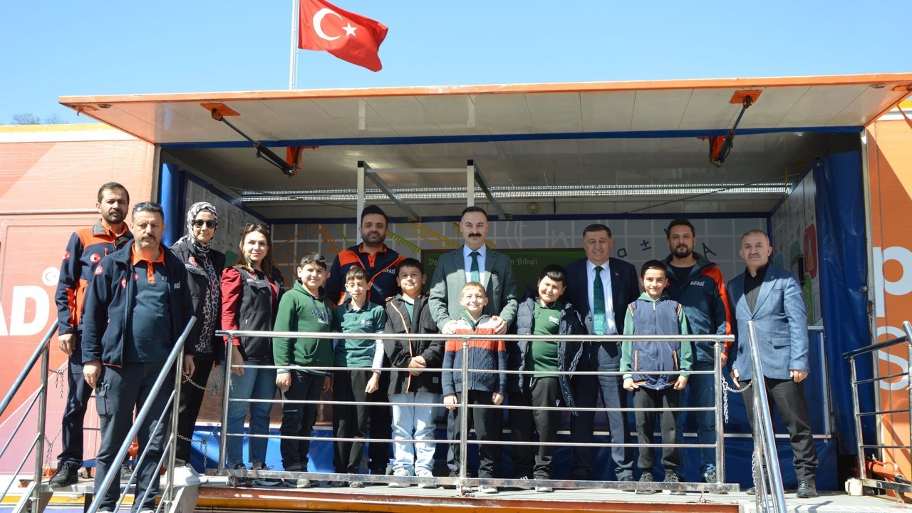 Türkiye'de yaşanan önemli depremlerin simüle edildiği tırda öğrencilere deprem anında yapılması gerekenler, çök-kapan-tutun ve deprem sonrası yapılacaklar hakkında bilgiler verildi.