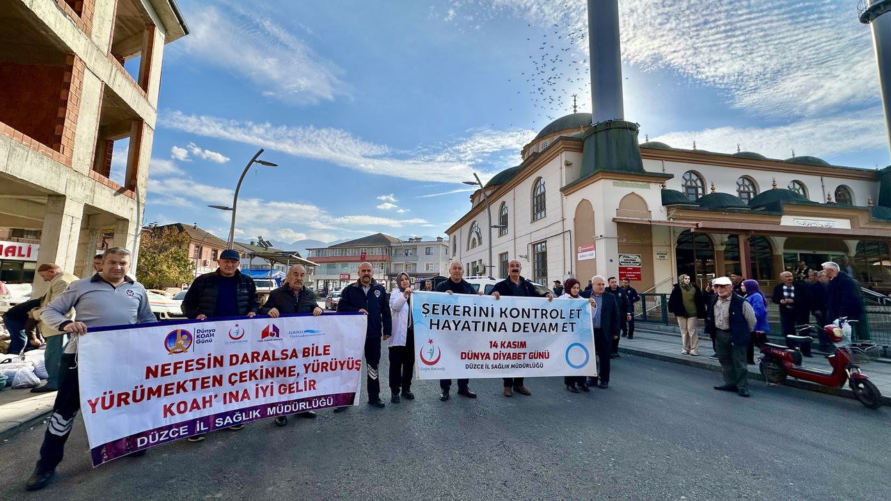 'Dünya Diyabet ve KOAH Günü' dolayısıyla Gölyaka İlçe Devlet Hastanesi ve Toplum Sağlığı Merkezi personeli ile vatandaşlar, Merkez Cami önünde toplanarak ellerinde dövizlerle Şehir Parkı'na kadar yürüdü.