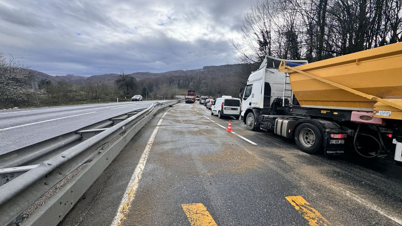 Makaslayan tırın yolun iki şeridini de kaplaması nedeniyle Akçakoca istikameti bir süreliğine ulaşıma kapandı.