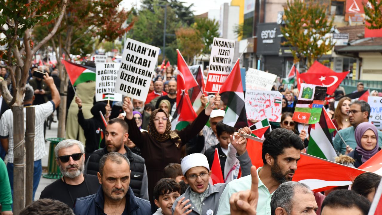 Ellerinde Türk ve Filistin bayrakları ile Gazze'de yaşanan dramın fotoğraflarının yer aldığı pankartlarla meydanı dolduranlar, 'Sumud'a selam, direnişe devam', 'siyonist İsrail, işbirlikçi Amerika', 'özgür Filistin, katil İsrail', 'Çocuklar uyurken susulur, ölürken değil', 'Tam bağımsız Filistin için yürü' sloganları attı.