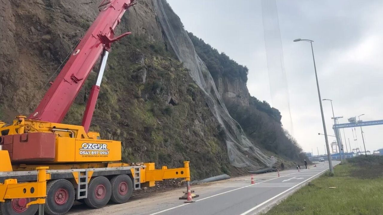 Karadeniz Ereğli-Akçakoca karayolunun Karadeniz Ereğli istikametinde, tersaneler mevkisini de kapsayacak şekilde yol güzergahında çelik ağ uygulaması vinç yardımları ile sürüyor.