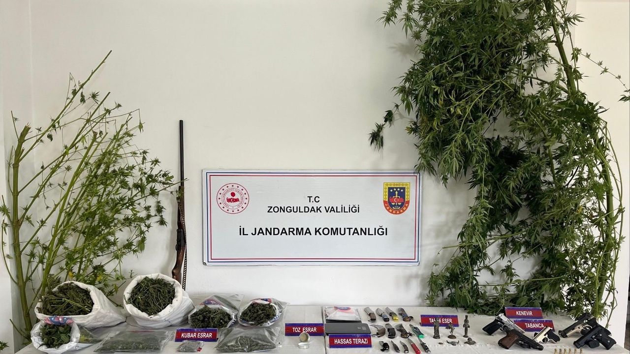 "Zonguldak İl Jandarma Komutanlığınca, “Narkotik Suçlarla Mücadele” kapsamında Kdz. Ereğli ilçesinde 6 adreste icra edilen eş zamanlı aramada, 2.864 Gram Kubar Esrar, 16 Gram Toz Esrar, 2 Kök Kenevir Bitkisi, 1 Adet Hassas Terazi, 96 Adet Kilitli Poşet, 5 Adet Kuru Sıkı Tabanca, 1 Adet Av Tüfeği, 5 Adet Tarihi Obje, 1 Adet Sikke, 12 Adet Bıçak ve Kama ele geçirilmiş, şüpheli 5 şahıs yakalanmıştır. Vatandaşlarımızın huzur ve güvenliğini sağlamak amacıyla suç ve suçlularla mücadelemiz kararlılıkla sürdürülmektedir."