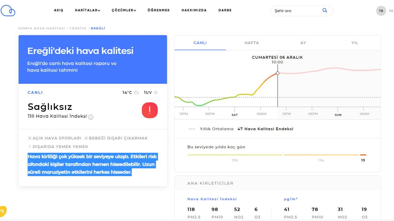 Çevre Şehircilik ve İklim Değişikliği Bakanlığı Hava İzleme Kalitesi resmi sonuçlarına göre Karadeniz Ereğli'de 6 Aralık 2025 tarihinde saat 10.00 itibariyle açıklanan verilerde hava kalitesi orta düzeyde.