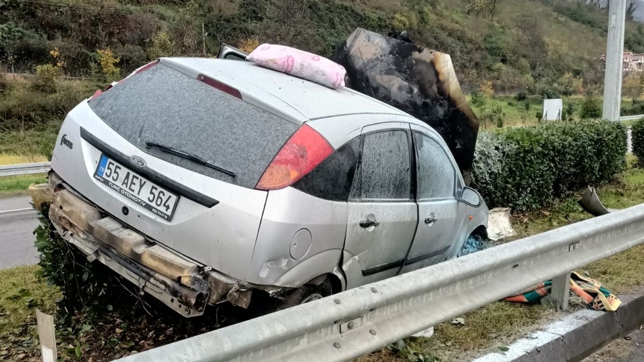 Karadeniz Sahil Yolu'nun hastane kavşağı mevkisinde S.M. idaresindeki 55 AEY 564 plakalı otomobil, sürücüsünün direksiyon hakimiyetini kaybetmesi sonucu refüjdeki bariyerlere çarptı.