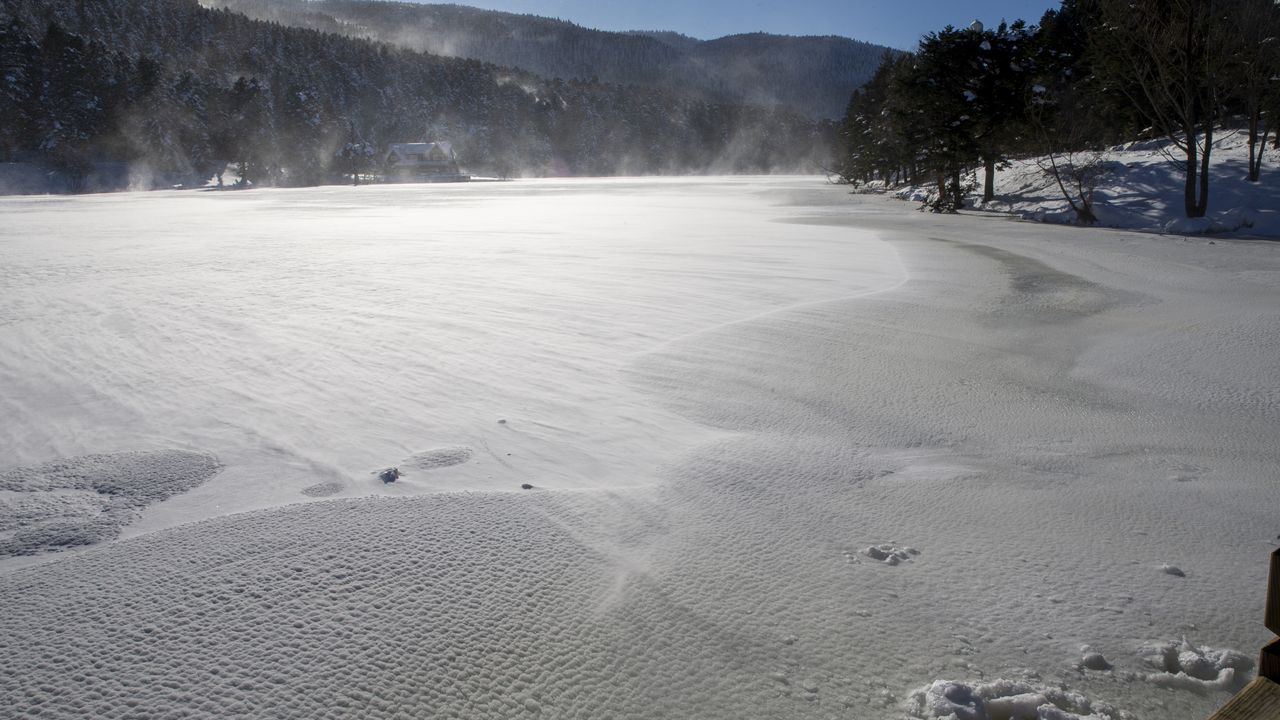 Kent merkezine yaklaşık 13 kilometre uzaklıkta bulunan tabiat parkındaki gölün yüzeyi, hava sıcaklığının sıfırın altına düşmesiyle dondu.