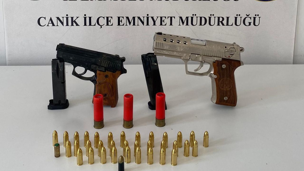 Şüphelinin ikametinde yapılan aramada, bulundurma ruhsatlı tabanca, kurusıkı tabanca ve 34 fişek ele geçirildi.