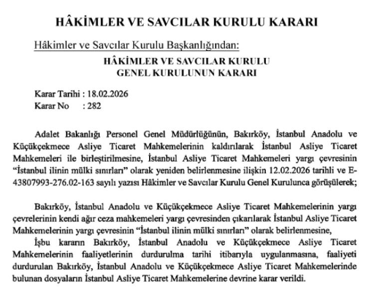 Karar, Adalet Bakanlığı Personel Genel Müdürlüğü'nün 12 Şubat 2026 tarihli yazısı doğrultusunda alındı. Buna göre; Bakırköy, İstanbul Anadolu ve Küçükçekmece Asliye Ticaret Mahkemeleri kaldırılarak İstanbul Asliye Ticaret Mahkemelerine birleştirildi.