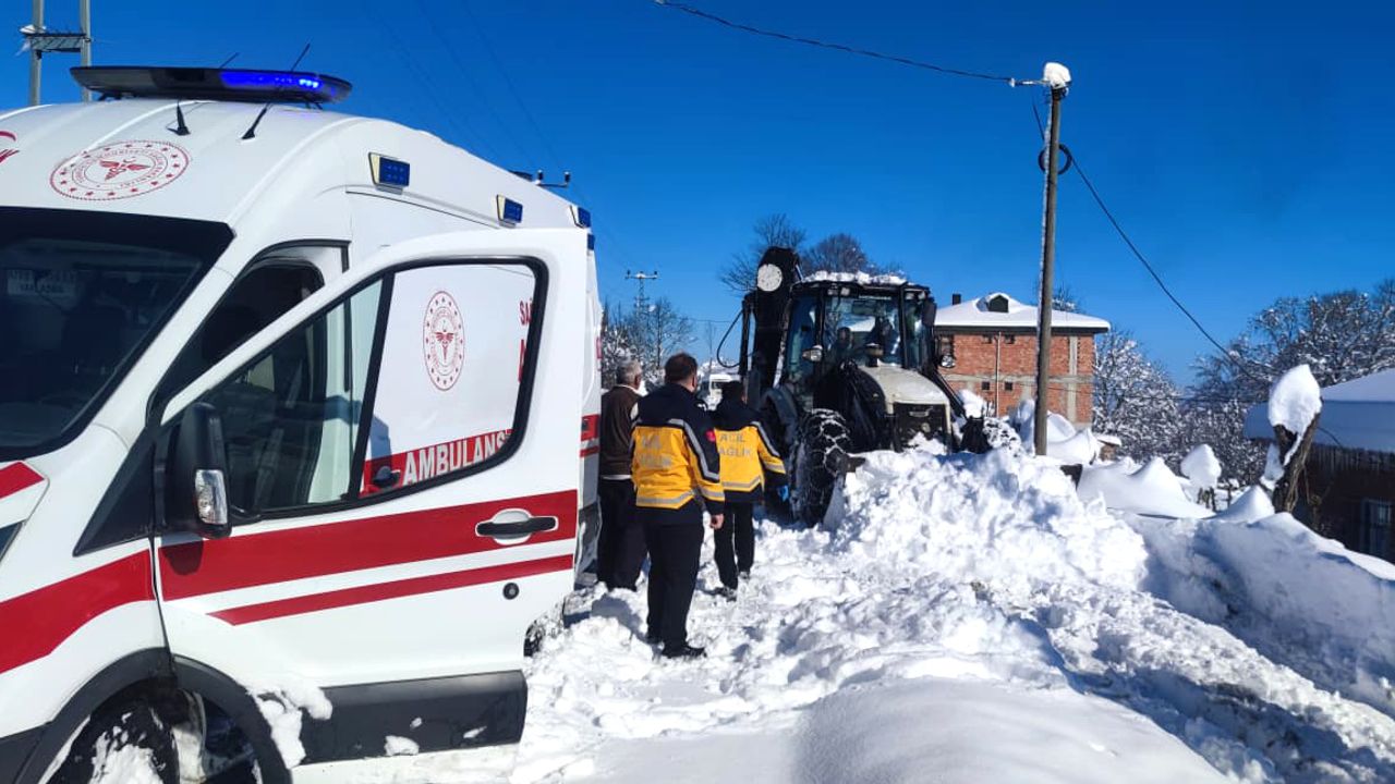 Seymenli Mahallesi'ndeki hastaya ulaşmak için hareket eden 112 Acil Sağlık ekiplerinin bulunduğu ambulans, kar nedeniyle yolda mahsur kaldı.