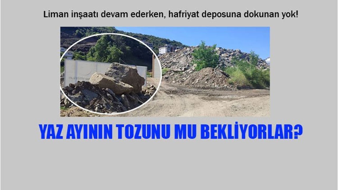 Daha önce TSO’nun okul yapacağını TOBB Genel Başkanı Rifat Hisarcıklıoğlu’nun da katıldığı açıklama ile müjde verilen alan, okul yapımının yılan hikayesine dönmesi üzerine hafriyat depolama alanı arayanların gözde yeri oldu. “Burası hafriyat deposu olarak kullanılabilir” diye kimin imza attığının açıklanması hafriyat deposunun liman inşaatının başlaması ile birlikte ilk önce boşaltılarak, bu halk sağlığını da tehdit eden görüntü kirliliğine sahip alanın temizlenmesi bekleniyor. Bu yalar içinde boşaltılması durumunda , yaz aylarının ortasında ve çok çok tozarak çevre kirliliği ya artacak. Yetkili ve etkililerin bu hafriyat deposunun bir an önce boşaltılması için harekete geçmeleri bekleniyor.