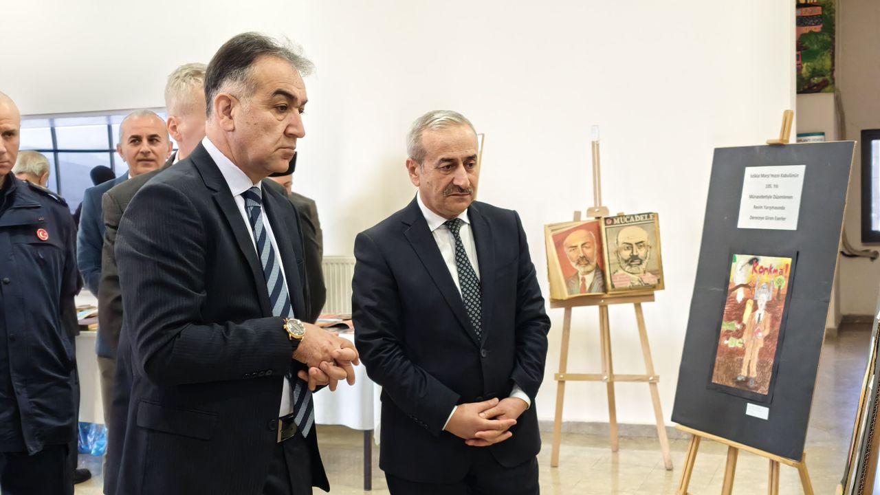 100. Yıl Kültür Merkezi'ndeki programda, Vali Oktay Çağatay ve beraberindeki protokol üyeleri, fuaye alanında oluşturulan sergiyi gezdi.