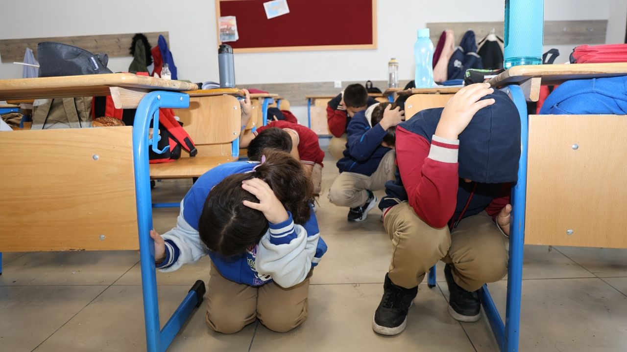 Tatbikat, 'çök-kapan-tutun' ve okul binasının tahliye edilmesi aşamalarıyla tamamlandı.