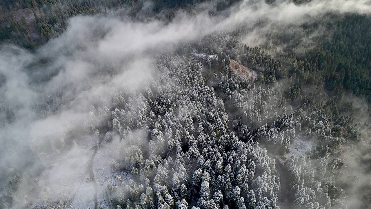 Kar ve sisin oluşturduğu manzara dronla görüntülendi.