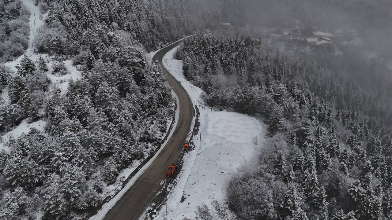 Karayolları ekiplerinin kar küreme ve tuzlama çalışması sürdürdüğü Ahmetusta Geçidi mevkisinde sürücüler dikkatli seyrediyor.