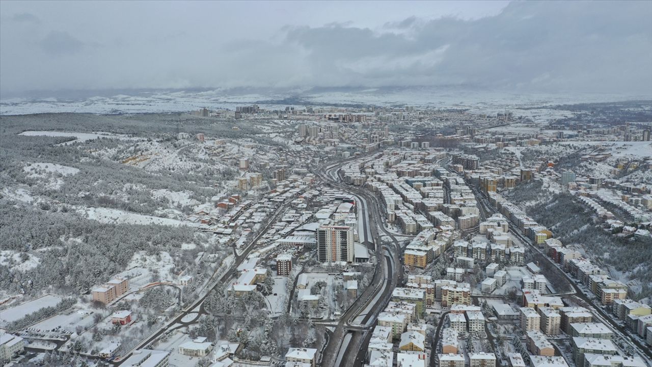 Ekipler, kapanan yolları açmak için çalışmalarını aralıksız sürdürken, karın kent merkezinde oluşturduğu manzara dron ile görüntülendi.