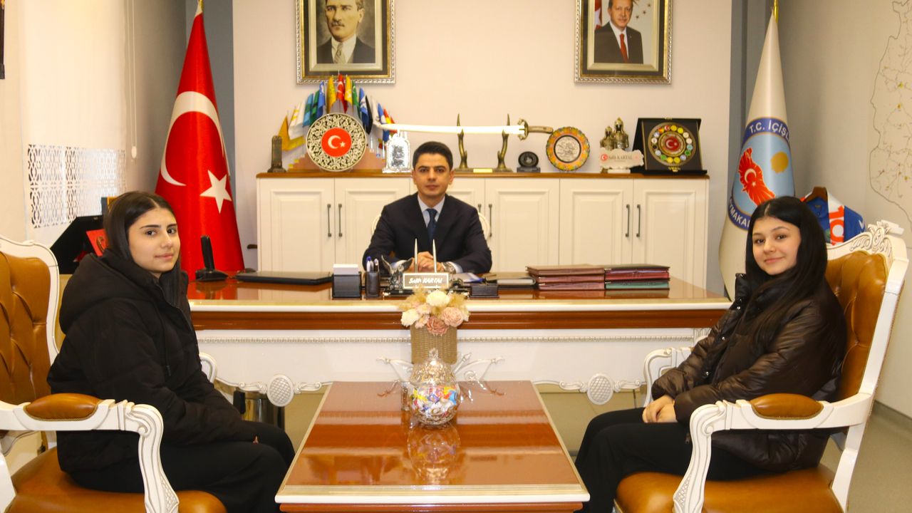 Kartal, hazırladıkları projeyle bölge birincisi olan Şehit İdris Bolat Anadolu Lisesi öğrencileri Damla Kılıç ve Ceylin Şahin'i makamında kabul etti.