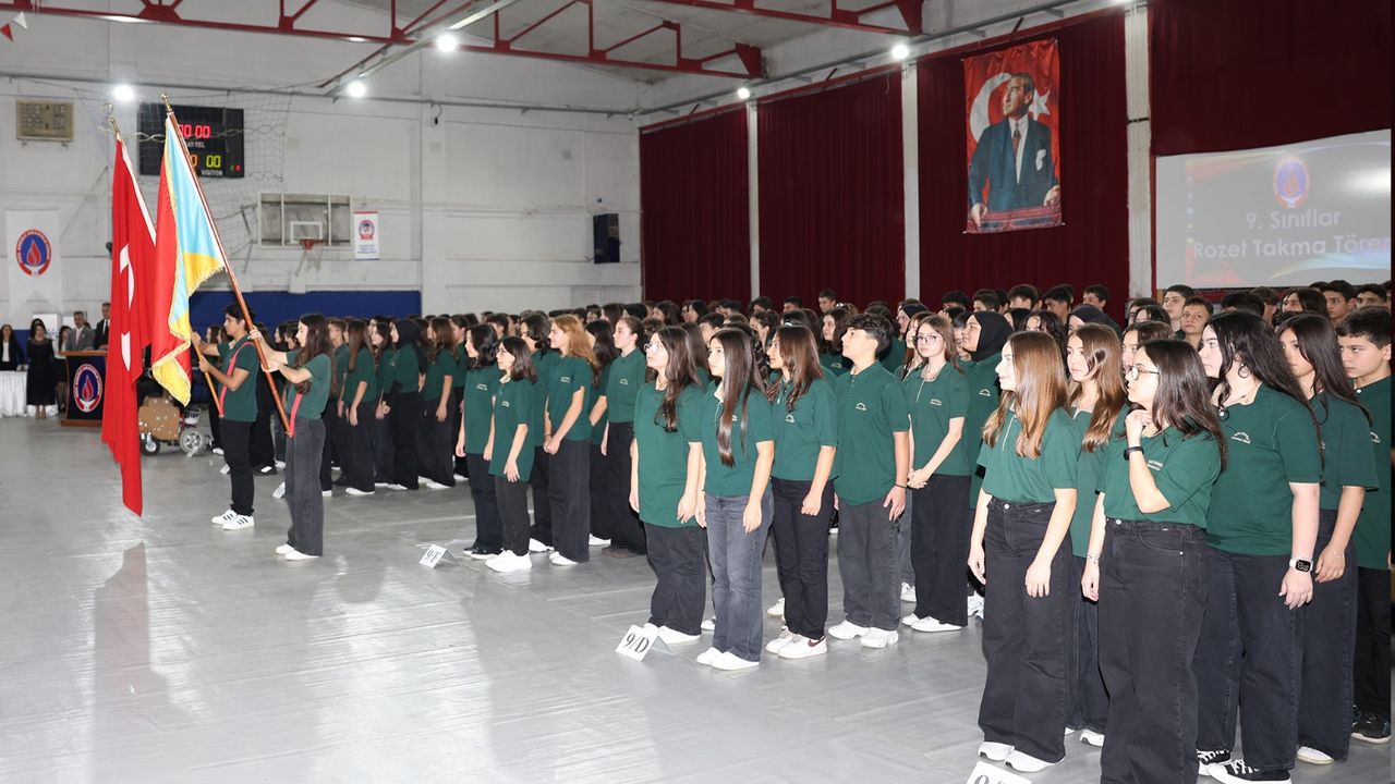 Tören, 9’uncu sınıf öğrencilerinin salondaki yerlerini almasının ardından saygı duruşunda bulunulması ve İstiklal Marşı’nın okunmasıyla başladı. Daha sonra öğrenciler, sözü ve bestesi okulun emekli müzik öğretmeni Gülay Aykan’a ait olan okul marşını hep birlikte seslendirdi.
