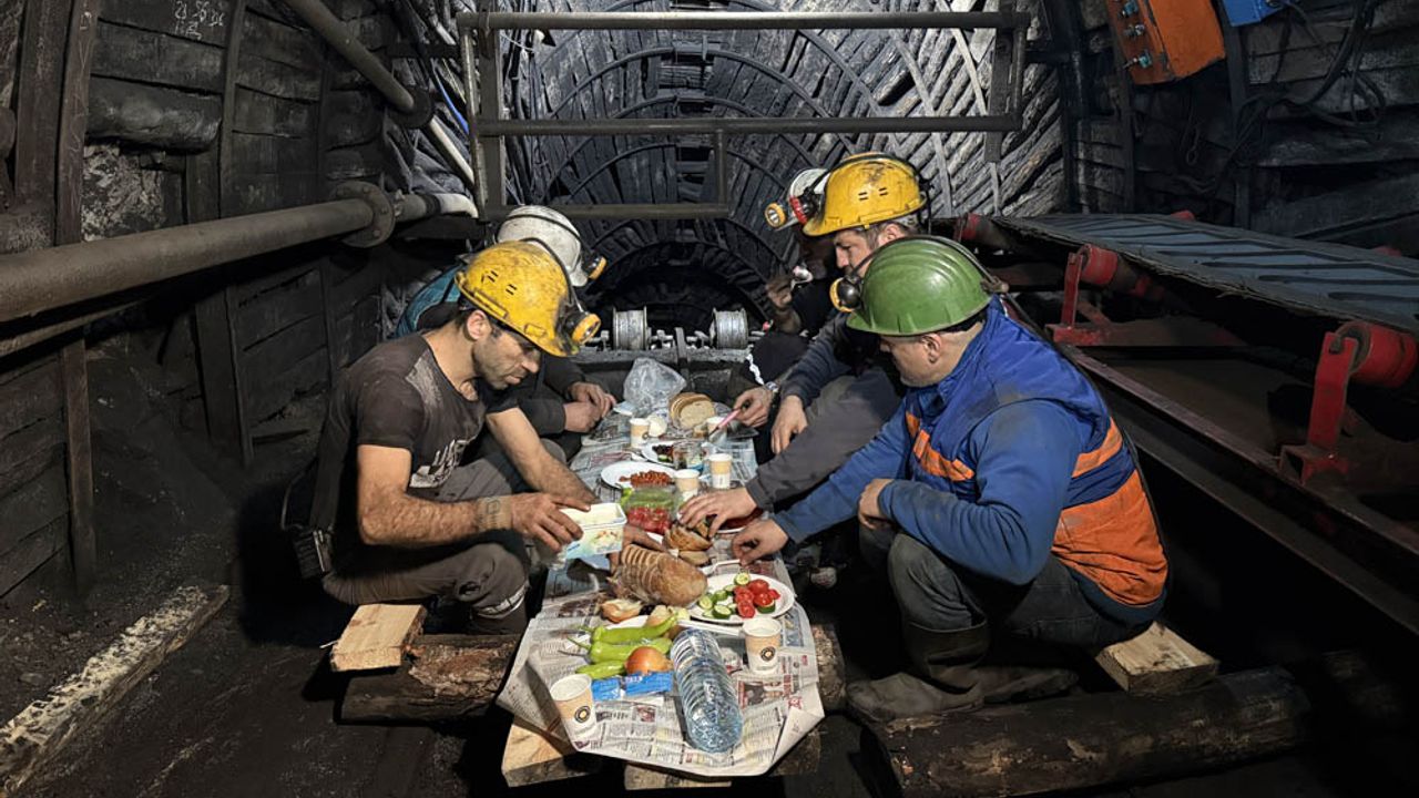 Zonguldak'ta yer altındaki zorlu mesailerini sürdüren maden işçileri, ramazan ayının ilk sahurunu kömür üretiminde kullanılan ağaç direklerden kurdukları sofrada yaptı.