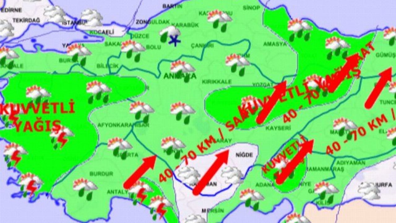 Meteoroloji, Marmara, Ege, Batı Akdeniz, İç Anadolu’nun kuzeybatısı, Batı Karadeniz'de kuvvetli yağış, kuvvetli rüzgar ve fırtına beklendiği uyarısında bulundu.ANKARA (İGFA) - Meteoroloji Genel Müdürlüğü tarafından yapılan son değerlendirmelere göre: Ülke genelinin parçalı ve çok bulutlu, Marmara, Ege, Batı Akdeniz, İç Anadolu’nun kuzeybatısı, Batı Karadeniz, Orta Karadeniz'in iç kesimleri, Aksaray, Kırşehir, Yozgat çevreleri ile Adana ve Kahramanmaraş’ın kuzey kesimlerinin yağmur ve sağanak, yer yer gök gürültülü sağanak yağışlı geçeceği tahmin ediliyor. Yağışların; Marmara, Ege, Batı Akdeniz, İç Anadolu’nun kuzeybatısı, Batı Karadeniz’in iç kesimleri ile Zonguldak ve Bartın çevrelerinde yer yer kuvvetli olması bekleniyor. Doğu Karadeniz’in iç kesimleri ile Doğu Anadolu’nun eğimli ve yüksek kesimlerinde çığ tehlikesi riski bulunmaktadır.