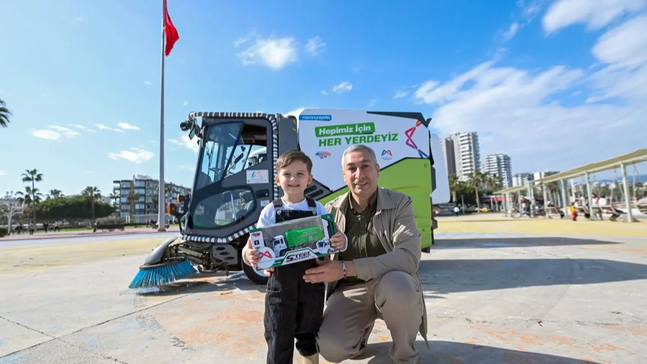 Ekipler, kent temizliği için gece gündüz görev yapan süpürge araçlarına büyük bir ilgi duyan 3 yaşındaki Ayaz'ın yüzünü güldürürken; oyuncak 'yeşil süpürge arabası', boyama kitapları ve su matarasından oluşan sürpriz hediyelerle de Ayaz'ın sevincini 2'ye katladı.