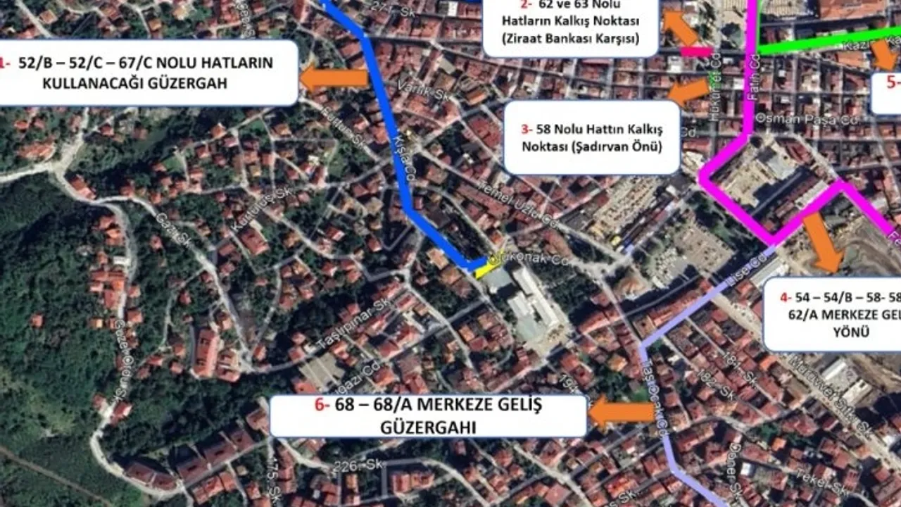 52/B, 52/C ve 67/C numaralı hatlar Atatürk Bulvarı - Kışla Caddesi - Eski Valilik güzergahını kullanacak.