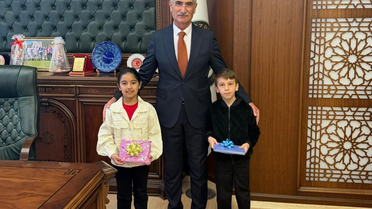 Pervanlar, Atatürk İlkokulu öğrencileri Zeynep Nisa Can ve Mehmet Zeki Sarık'ı makamında ağırladı.