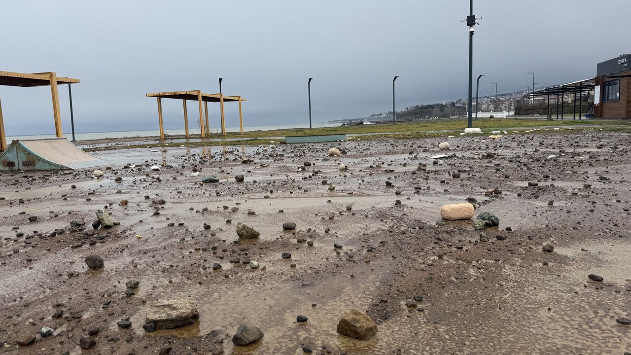 Çayeli ilçesinde fırtına nedeniyle denizde dev dalgalar oluştu. Dalgaların taşıdığı irili ufaklı taşlar, Karadeniz Sahil Yolu'nda ulaşımda zaman zaman aksamaya yol açtı.