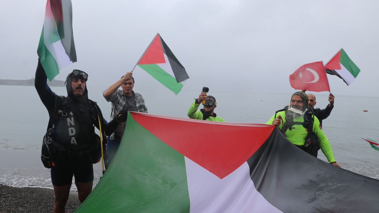 RİZE (AA) - Eğitim Araştırma Yardımlaşma ve Arama Kurtarma Derneği (ANDA) Trabzon İl Başkanı Yunus Ersoy ile ekip amiri Zafer Koçal, İsrail'in Gazze'ye saldırılarına dikkati çekebilmek için Karadeniz'de dalış gerçekleştirdi.