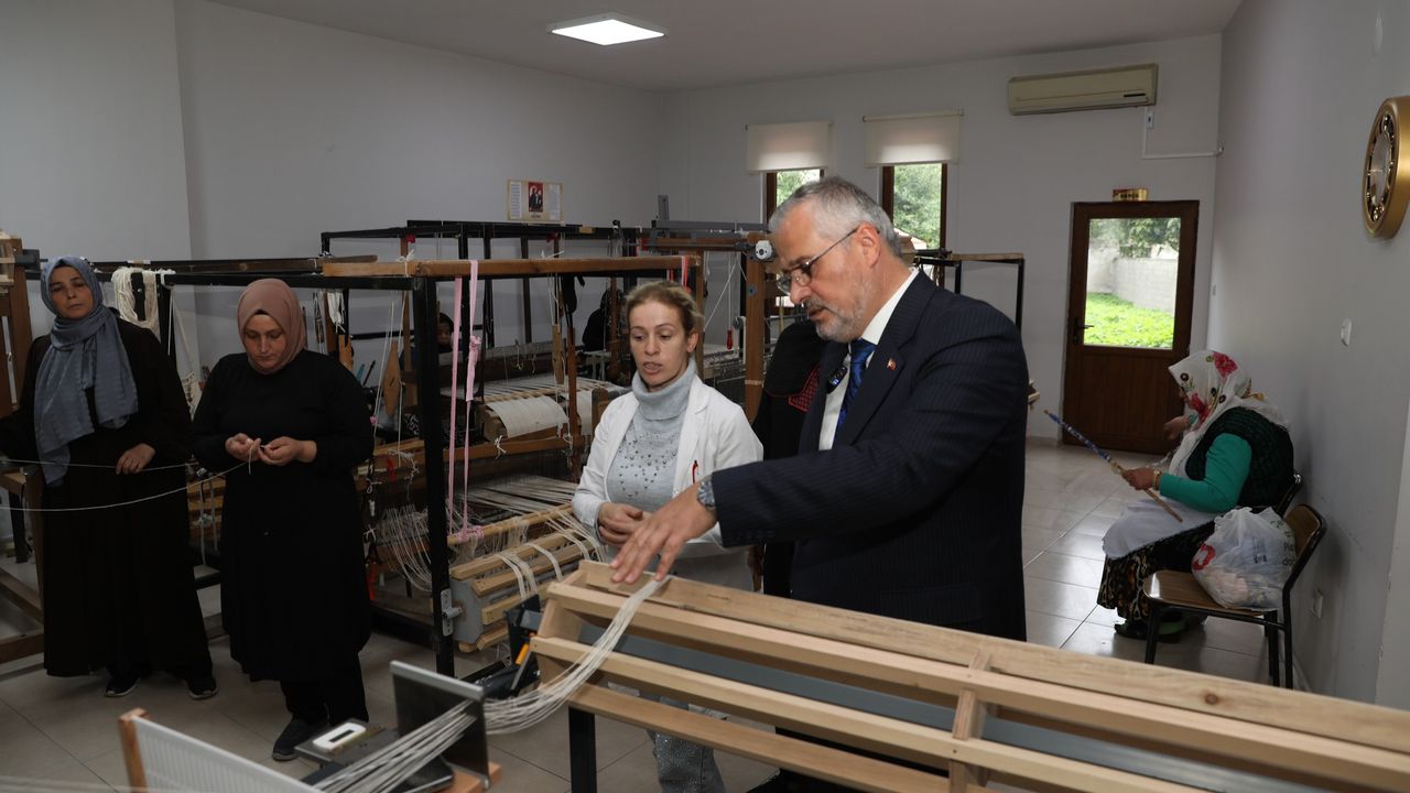 Kılıç, Geleneksel Sanatlar Merkezi'nde devam eden rölyef, tel kırma, sim sarma, kilim ve keten dokuma ile filografi kurslarında incelemede bulundu.
