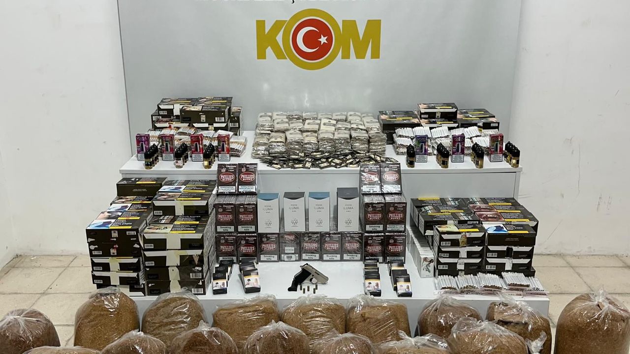 Söz konusu adreslerdeki aramada 6 milyon 143 bin 160 boş, 94 bin 756 doldurulmuş makaron (filtreli sigara kağıdı), 2 bin 669 kilogram kaçak tütün, 410 paket nargile tütünü, 165 paket kaçak pipo tütünü, 547 bandrol, 7 elektronik sigara, 4 elektronik sigara cihazı, 24 elektronik sigara likidi, 5 elektrikli sigara sarma makinesi, kompresör, kuru sıkı tabanca ve 5 fişek ele geçirildi.